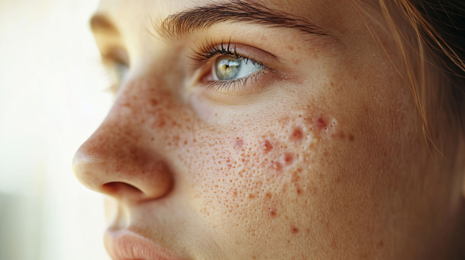 Unreine Haut erkennt man an häufigen Pickeln, Mitessern und eventuell Pusteln. Die Poren wirken vergrößert und das Hautbild uneben. Rötungen um die Unreinheiten sind üblich, und die Haut kann insgesamt etwas entzündet oder gereizt aussehen. Häufig treten die Unreinheiten in den typischen Regionen wie T-Zone, Kinn und Wangen auf. Bei leichter Ausprägung zeigt die Haut vereinzelt kleine Pickel oder Mitesser; in stärkeren Fällen können sich auch Knoten und tieferliegende Entzündungen bilden. Unreine Haut geht oft mit einem fettigen Glanz einher, muss aber nicht immer extrem ölig sein – manchmal sind einfach die Poren veranlagt, schneller zu verstopfen.